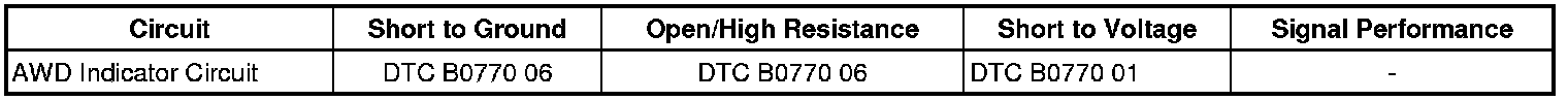A short to ground on the AWD indicator control circuit will cause the AWD indicator to remain on at all times. An open or high resistance will cause the AWD indicator to be inoperative during the 2 second bulb check.