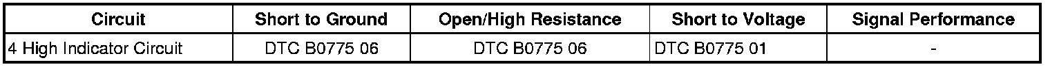 A short to ground on the 4 high indicator control circuit will cause the 4 high indicator to remain on at all times. An open or high resistance will cause the 4 high indicator to be inoperative during the 2 second bulb check.