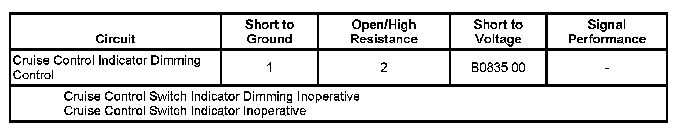 * The BCM detects excessive current in the cruise control indicator dimming signal circuit.