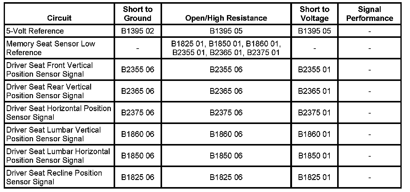If less than 4.75 volts, test the 5-volt reference circuit to all position sensors for a short to ground or an open. If the circuit tests normal, replace the memory seat module.
