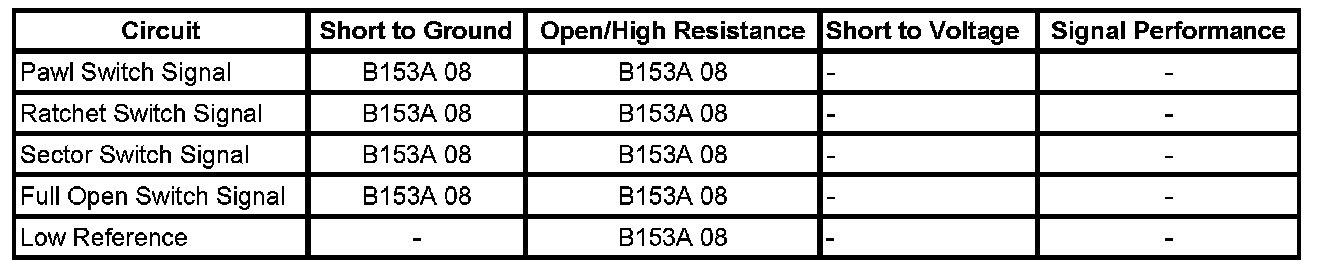 When the pawl switch signal remains inactive during a power open cycle, DTC B153E 08 may also set.