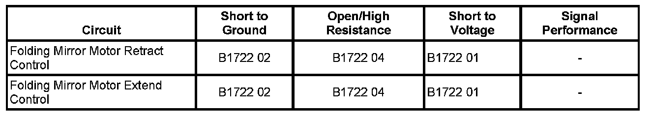 An improper voltage level is seen on either the folding mirror motor retract control circuit or the folding mirror motor extend control circuit.