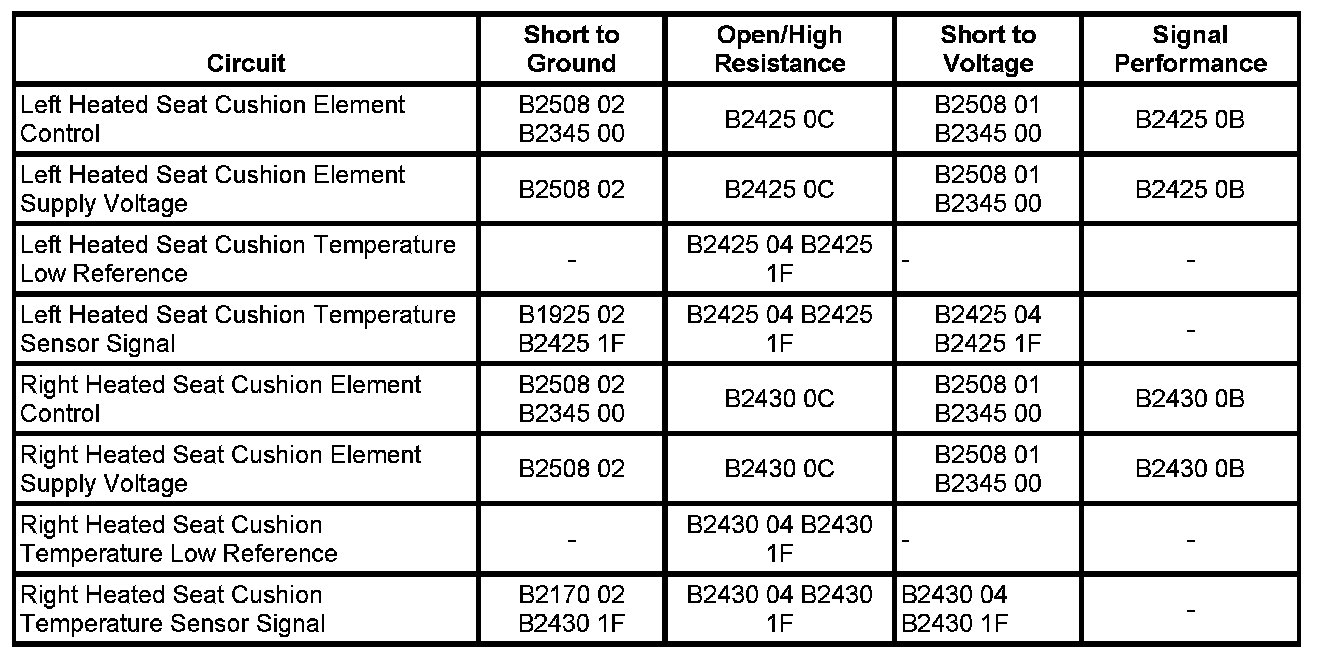 - Left Seat Heater Cushion Sensor Circuit Shorted to Ground