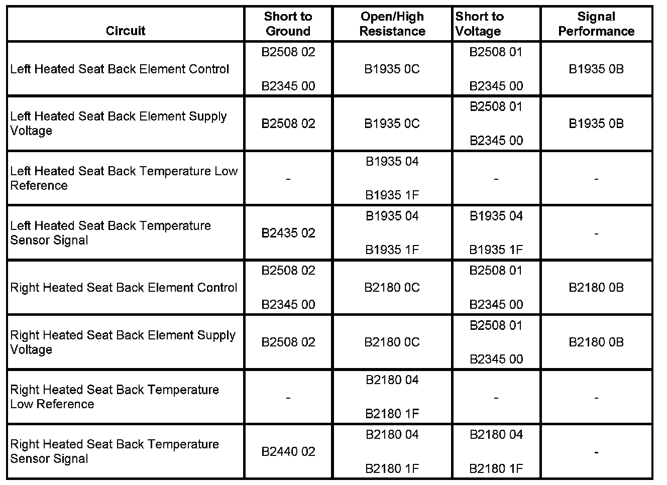 ^ If greater than 300K ohms, test the signal circuit and low reference circuit for an open/high resistance. If the circuits test normal, replace the seat back heater element.