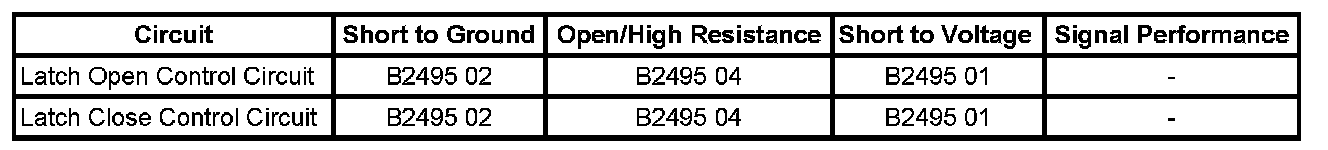 The latch motor is a bi-directional motor and latch or unlatch operation is the result of the direction of the motor rotation. The liftgate control module controls the latch motor through the control circuits by suppling power and ground in the appropriate polarity. The motor control circuits are monitored by the liftgate control module prior to activation for a high or low condition and during motor operation for an insufficient current flow condition.