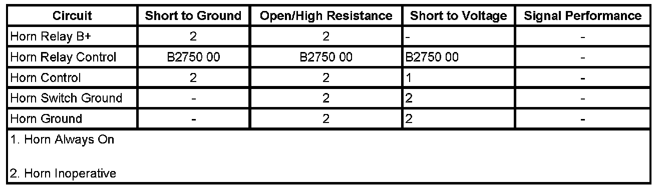 ^ If the test lamp is always OFF, test the horn relay control circuit for a short to voltage or an open/high resistance. If the circuit tests normal, replace the BCM.