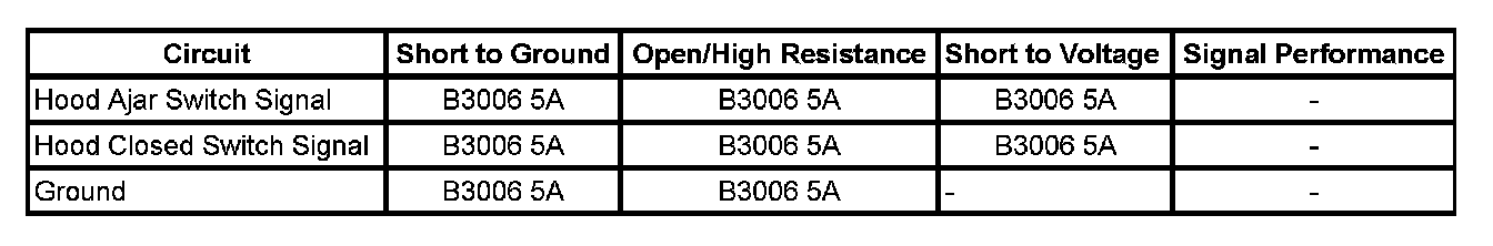 The body control module (BCM) monitors the voltage input of the hood open switch signal circuit and the hood open closed switch signal circuit. With the hood open, the hood ajar portion of the switch is closed, grounding the hood ajar switch signal circuit from the BCM, and the hood closed portion of the switch is open. With the hood closed, the hood closed portion of the switch is closed, grounding the hood closed switch signal circuit from the BCM, and the hood ajar portion of the switch is open. During proper operation, the two separate voltage signals at the BCM should never be at the same voltage.