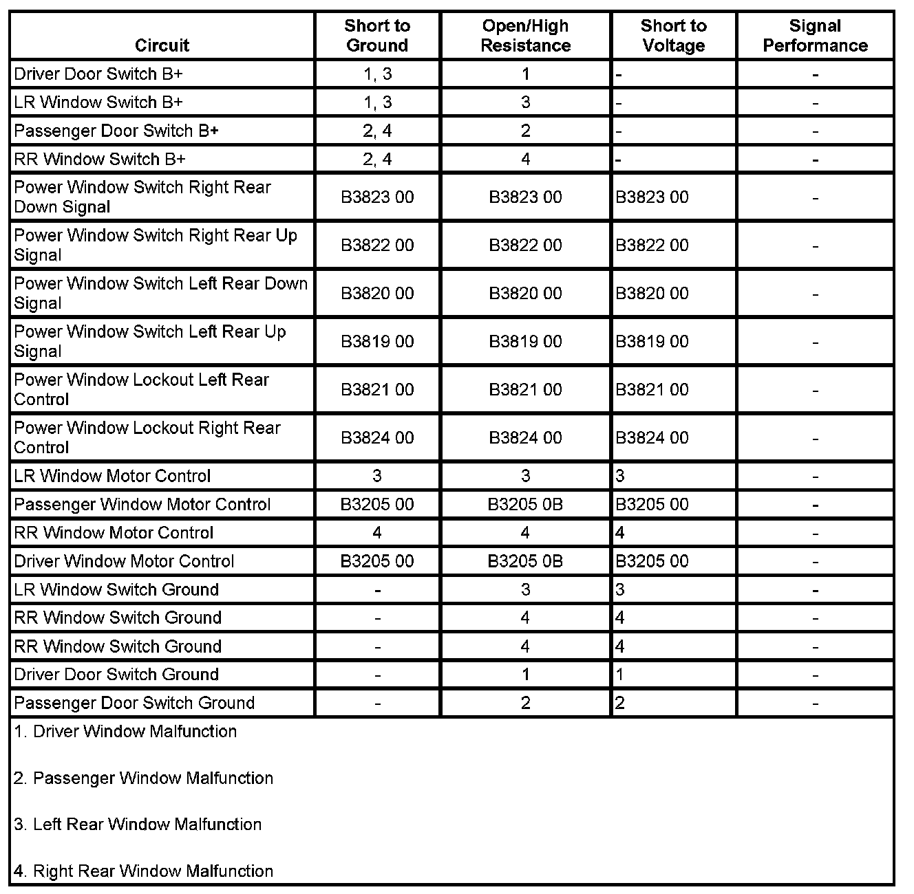 The DDS or PDS detects a short to ground or short to voltage on their respective window motor control circuit.