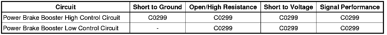 1. DTC C0299 will set as result of power brake booster actuator or circuit failure, test for power, and ground circuits to the EBCM. These electrical failures will typically be set immediately after key-up.