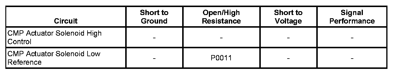 ^ If the CMP solenoid and the circuit test normal, then refer to Camshaft Position Actuator Magnet Cleaning and Inspection and Camshaft Position Actuator Solenoid Valve Inspection (On-Vehicle) Camshaft Position Actuator Solenoid Valve Inspection (Off-Vehicle).