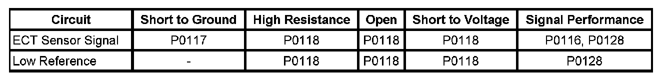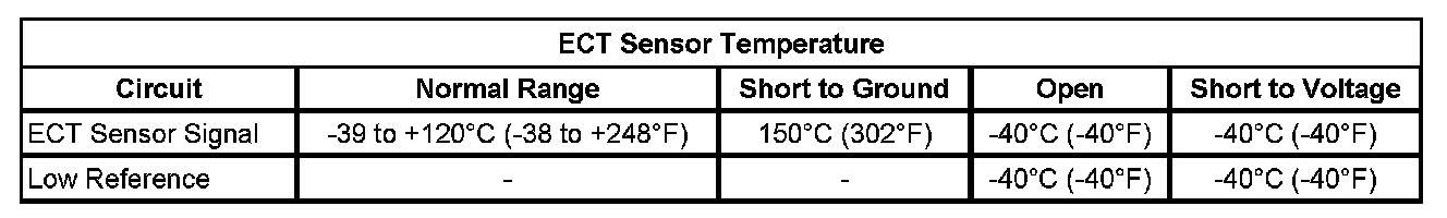 Measure and record the resistance of the ECT sensor at various ambient temperatures, then compare those measurements to the Temperature vs Resistance table. Refer to Temperature Versus Resistance.
