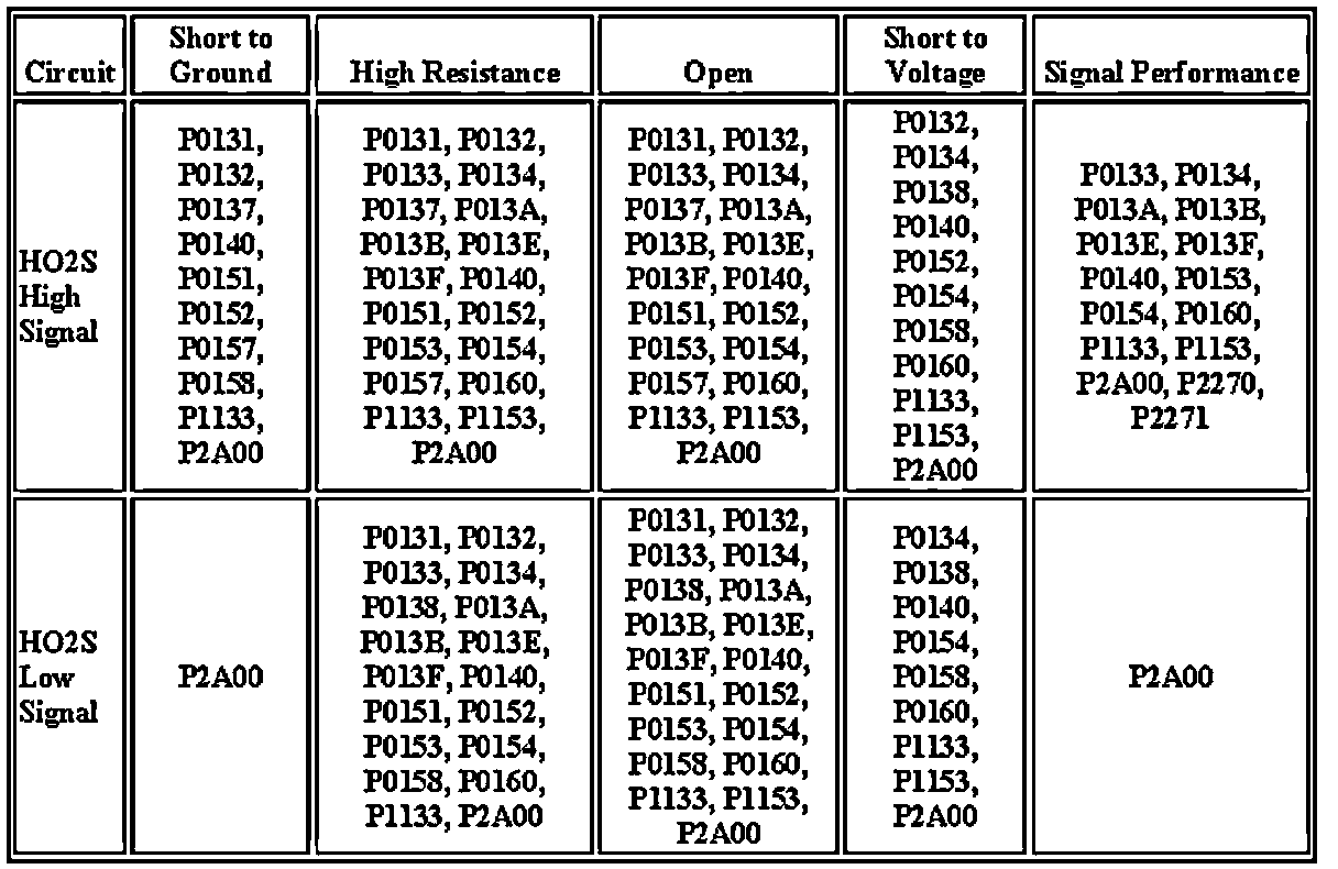 DTC P0133, P0134, P013A, P013B, P013E, P013F, P0140, P1133, P2270, P2271, or P2A00
