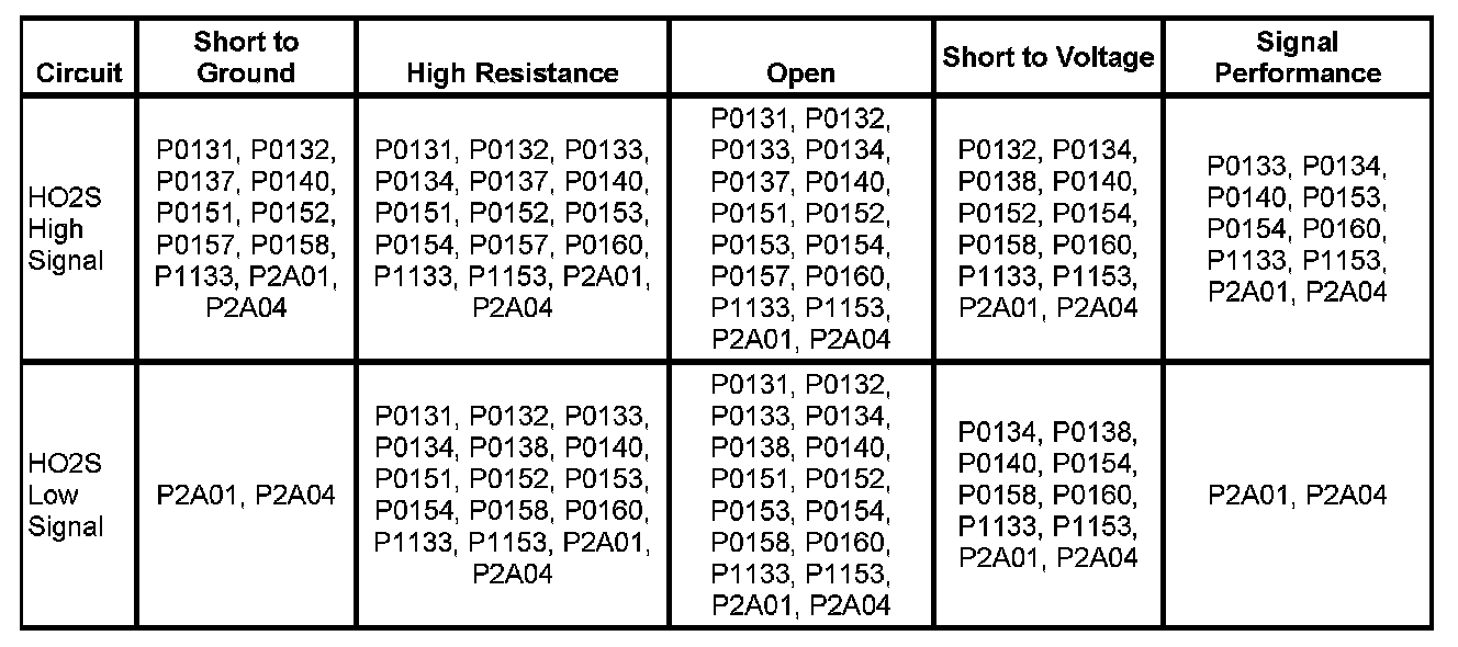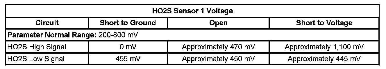 * The ECM detects that the HO2S 1 Voltage parameter is less than 50 mV.