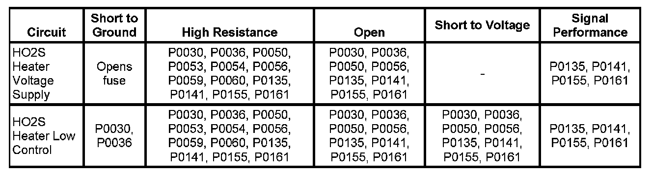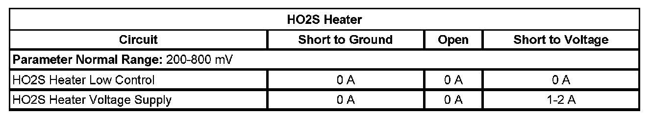 * The ECM detects that the affected HO2S heater low control circuit parameter is between 2.185-9.512 ohms at engine start-up.