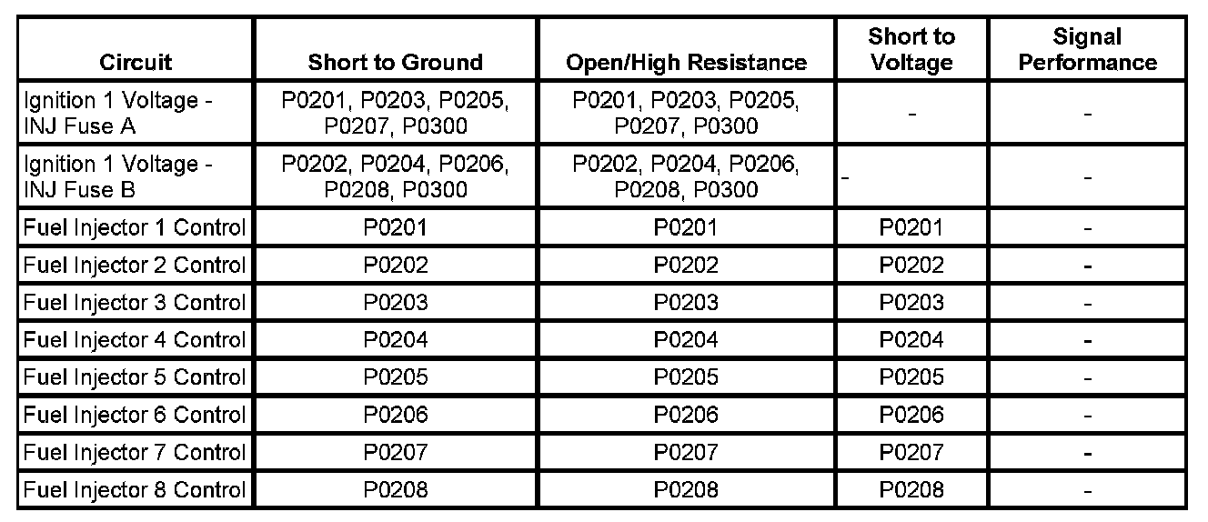 DTC P0201, P0202, P0203, P0204, P0205, P0206, P0207, or P0208