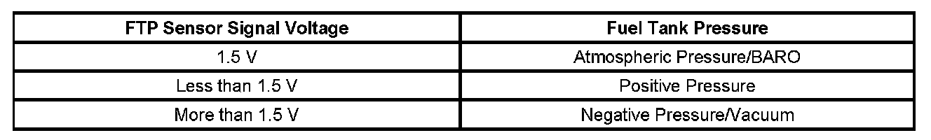 1. Ignition ON and fuel cap removed, verify that the FTP sensor parameter is between 1.3-1.7 volts.