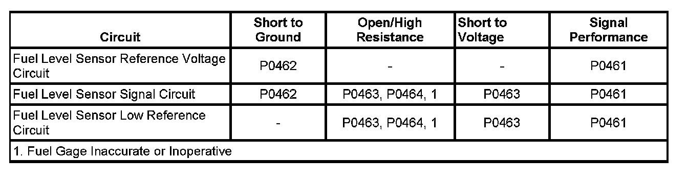 The fuel level sensor changes resistance in response to the fuel level. The engine control module (ECM) monitors the signal circuit of the fuel level sensor in order to determine the fuel level. When the fuel tank is full, the sensor resistance is low and the ECM senses a low signal voltage. When the fuel tank is empty, the sensor resistance is high and the ECM senses a high signal voltage. The ECM uses the signal circuit of the fuel level sensor in order to calculate the percentage of remaining fuel in the tank. The ECM sends the fuel level percentage via GMLAN serial data circuit to the instrument cluster in order to control the fuel gage. The fuel information is also used for misfire and evaporative emission (EVAP) diagnostics.