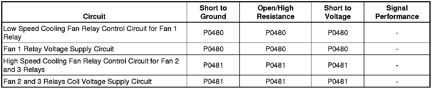 When the ECM is commanding a fan relay ON, the voltage of the control circuit should be low, near 0 volts. When the ECM is commanding a fan relay OFF, the voltage of the control circuit should be high, near battery voltage. If the ECM detects that the actual voltage of the relay control circuit is different than the expected voltage, DTC P0480 or P0481 will set and the affected ECM driver will be disabled.
