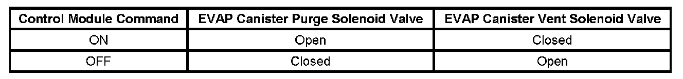 The following table illustrates the relationship between the ON and OFF states, and the Open or Closed states of the EVAP canister purge and vent solenoid valves.