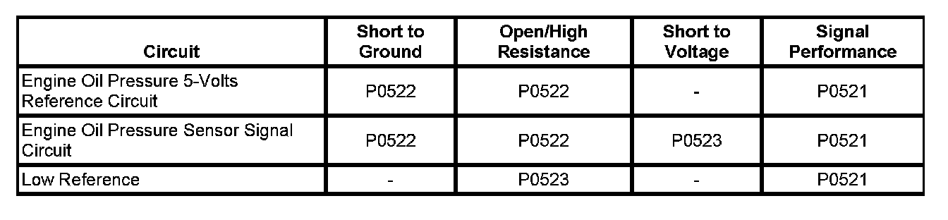 The engine oil pressure (EOP) sensor changes voltage based on the engine oil pressure. The EOP sensor is a 3-wire sensor comprising of the signal circuit, the low reference circuit and the 5-volt reference circuit. The engine control module (ECM) supplies 5 volts to the EOP sensor via the 5-volt reference circuit and provides ground via the EOP low reference circuit. The ECM monitors the signal circuit of the EOP sensor to determine if the EOP sensor voltage is within the normal operating range of approximately 1-4 volts. When the engine oil pressure is high, the EOP sensor voltage is high and the ECM senses a high signal voltage. When the engine oil pressure is low, the EOP sensor voltage is low and the ECM senses a low signal voltage. The ECM sends the EOP information to the instrument panel cluster (IPC) via GMLAN serial data message. The ECM can also predict oil pressure as a function of engine speed and engine temperature.