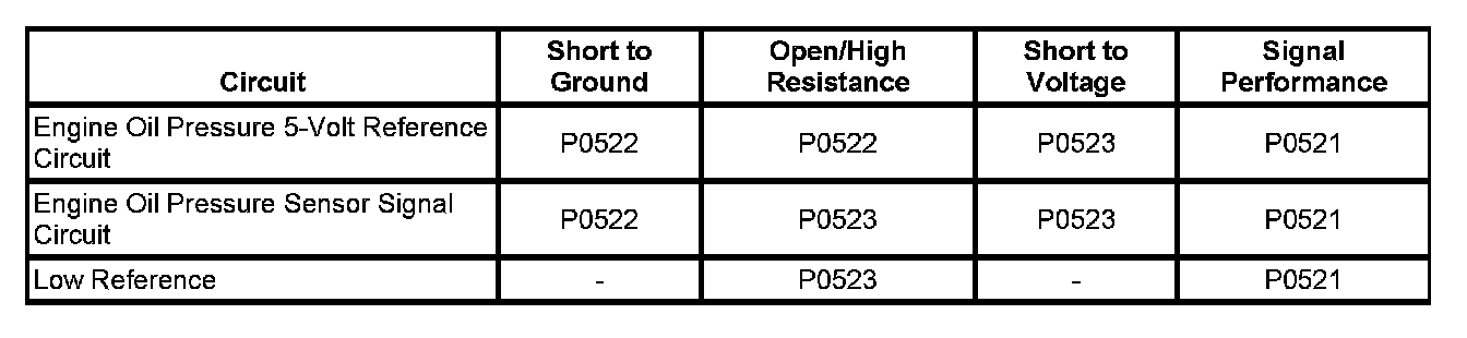 The engine oil pressure (EOP) sensor changes voltage based on the engine oil pressure. The EOP sensor is a 3-wire sensor comprising of the signal circuit, the low reference circuit and the 5-volt reference circuit. The engine control module (ECM) supplies 5 volts to the EOP sensor via the 5-volt reference circuit and provides ground via the EOP low reference circuit. The ECM monitors the signal circuit of the EOP sensor to determine the EOP sensor voltage is within the normal operating range of approximately 1-4 volts. When the engine oil pressure is high, the EOP sensor voltage is high and the ECM senses a high signal voltage. When the engine oil pressure is low, the EOP sensor voltage is low and the ECM senses a low signal voltage. The ECM sends the EOP information to the instrument panel cluster (IPC) via GMLAN serial data message.