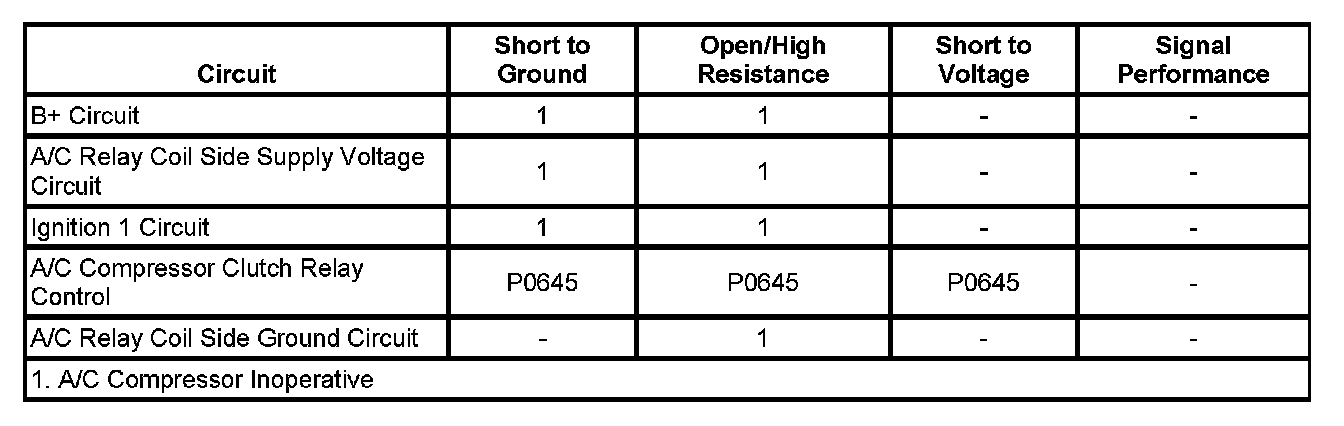 The ECM detects an open on the control circuit of the A/C compressor clutch relay when commanded OFF with the engine in crank or run status.