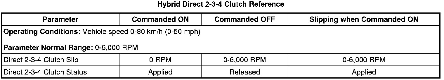 2. Operate the vehicle to induce a shift from 1st to 4th gear while observing the Direct 2-3-4 Clutch Slip parameter. Stop the vehicle and turn the ignition OFF for 30 seconds. Perform this action 2 times. The Direct 2-3-4 Clutch Slip parameter should display 0 RPM when the Direct 2-3-4 Clutch Status parameter displays Applied.