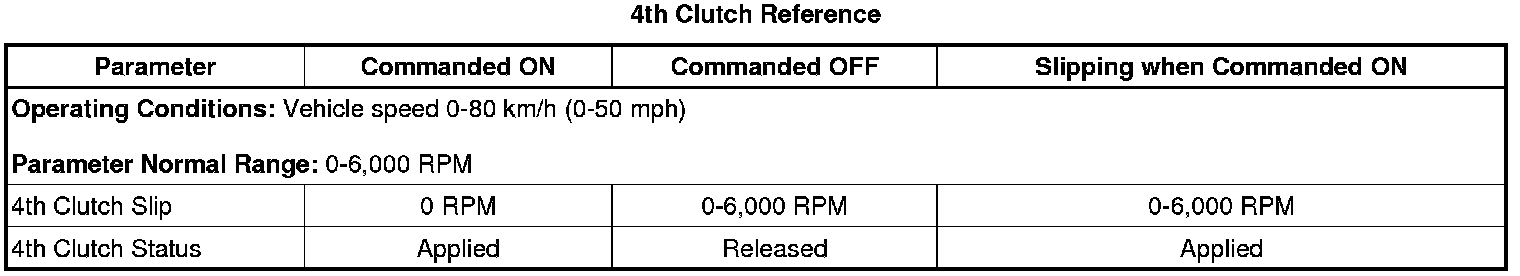 2. Operate the vehicle to induce a shift from 3rd to 4th gear while observing the 4th Clutch Slip parameter. Stop the vehicle and turn the ignition OFF for 30 seconds. Perform this action 2 times. The 4th Clutch Slip parameter should display 0 RPM when the 4th Clutch Status parameter displays Applied.
