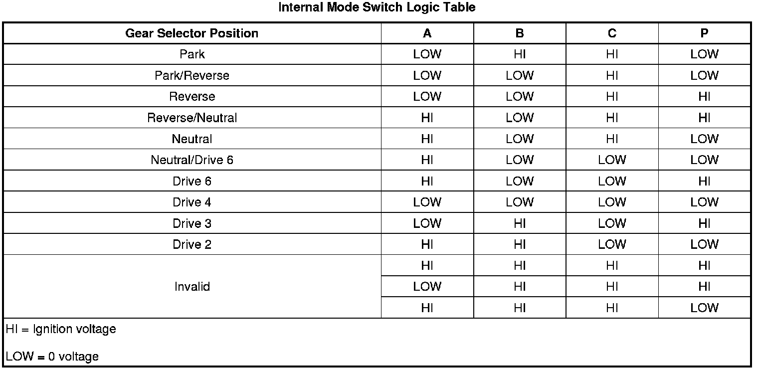 The internal mode switch (IMS) assembly is a sliding contact switch that connects to the control solenoid (w/body and TCM) valve assembly within the transmission. The 4 inputs to the transmission control module (TCM) from the switch indicate which position is selected by the transmission manual shaft. The input voltage at the TCM is high when the switch is open and low when the switch is closed to ground. The state of each input is displayed on the scan tool as IMS. The IMS input parameters represented are transmission range signal A, Signal B, signal C, and signal P.