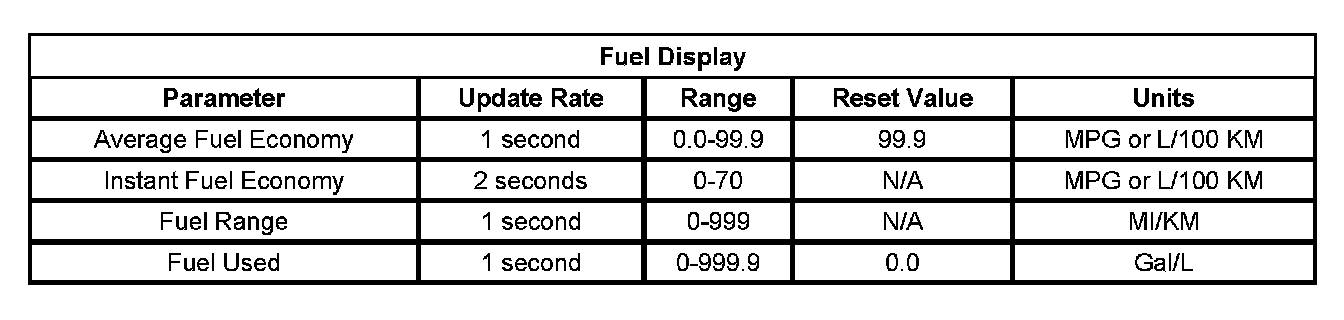 The engine control module (ECM) sends the average fuel economy GMLAN message to the instrument panel cluster (IPC). The value of this mode is retained during ignition OFF and can be changed between English units and metric units by selecting from the driver information center (DIC) options menu.