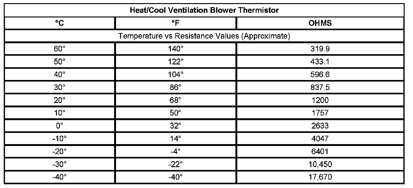 Important: If the resistance is measured with the seat still warm or cool, the resistance values will vary. At 68°F, (20°C) the nominal resistance value is 1200 ohms ±5 percent. For hotter or colder ambient temperatures, refer to the Temperature vs Resistance table below. The delta resistance values between the seat cushion and seat back temperature sensors should not be greater than 2000 ohms.