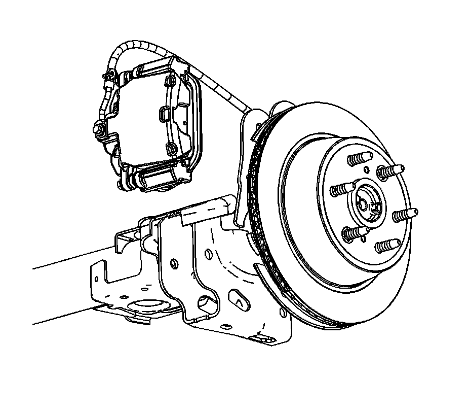 Notice: Support the brake caliper with heavy mechanic wire, or equivalent, whenever it is separated from its mount and the hydraulic flexible brake hose is still connected. Failure to support the caliper in this manner will cause the flexible brake hose to bear the weight of the caliper, which may cause damage to the brake hose and in turn may cause a brake fluid leak.