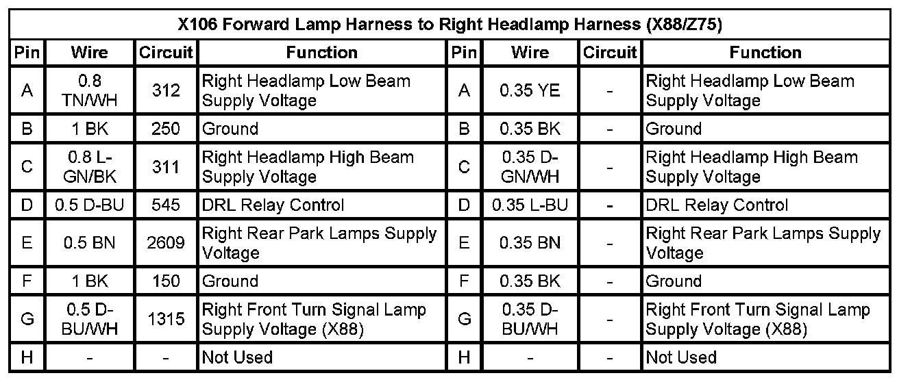 X106 Forward Lamp Harness to Right Headlamp Harness (X88/Z75)