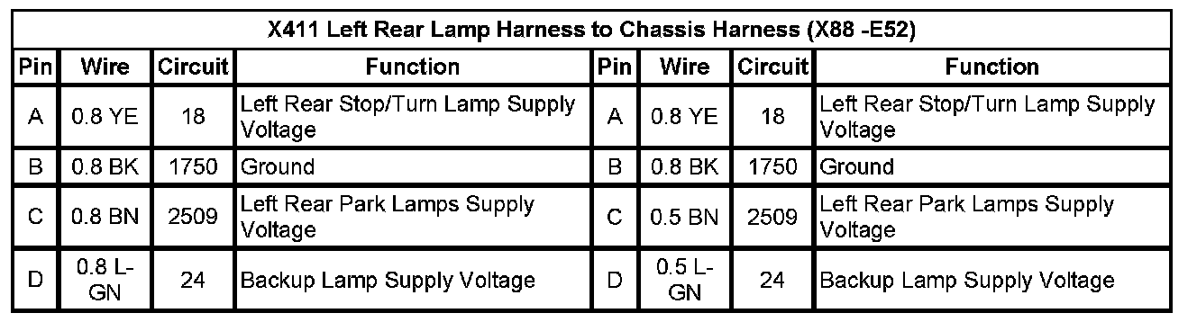 X411 Left Rear Lamp Harness to Chassis Harness (X88 -E52)