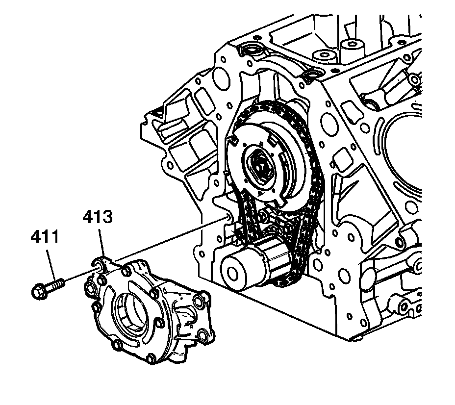 2. Install the oil pump (413) onto the crankshaft sprocket until the pump housing contacts the face of the engine block.