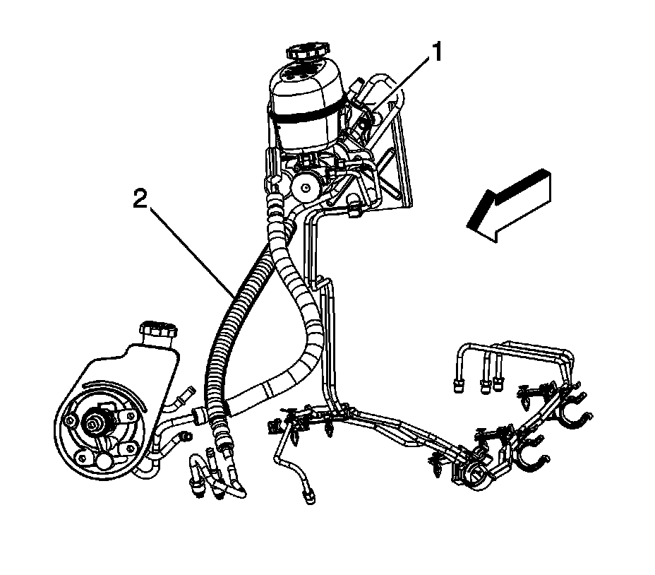 2. Install the power steering gear inlet hose (2) to the power brake booster (1) and hand tighten only. Rotate the power steering gear inlet hose clockwise until the it contacts the power brake booster housing and then hold it in position while tightening it to the fitting specification.
