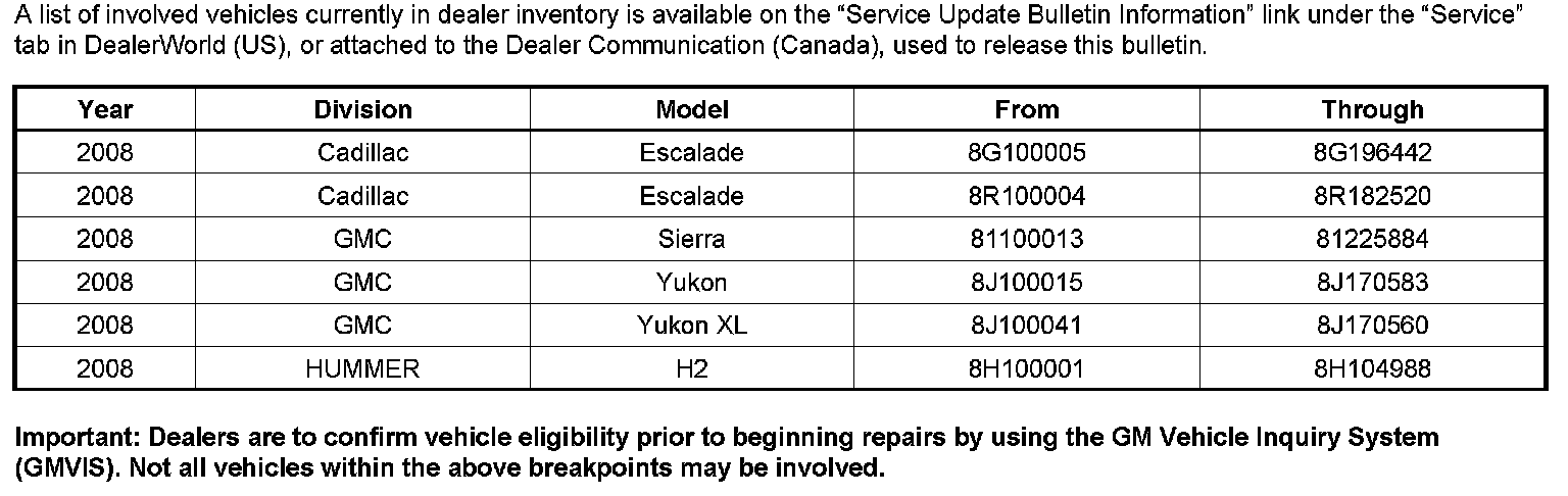 This bulletin provides a service procedure to reprogram the Engine Control Module (ECM) calibration on certain 2008 Cadillac Escalade; GMC Sierra, Yukon, Yukon XL; and HUMMER H2 vehicles, equipped with a 6.2L V8 (RPO L92 VIN - 8) engine. The revised calibration corrects a Service Engine Soon (SES) light for DTC P1400 after a cold start. To verify if an updated calibration is required, refer to the following procedure in this bulletin. This service procedure should be completed on involved vehicles currently in dealership inventory as soon as possible, but no later than January 31, 2009, at which time this bulletin will expire.