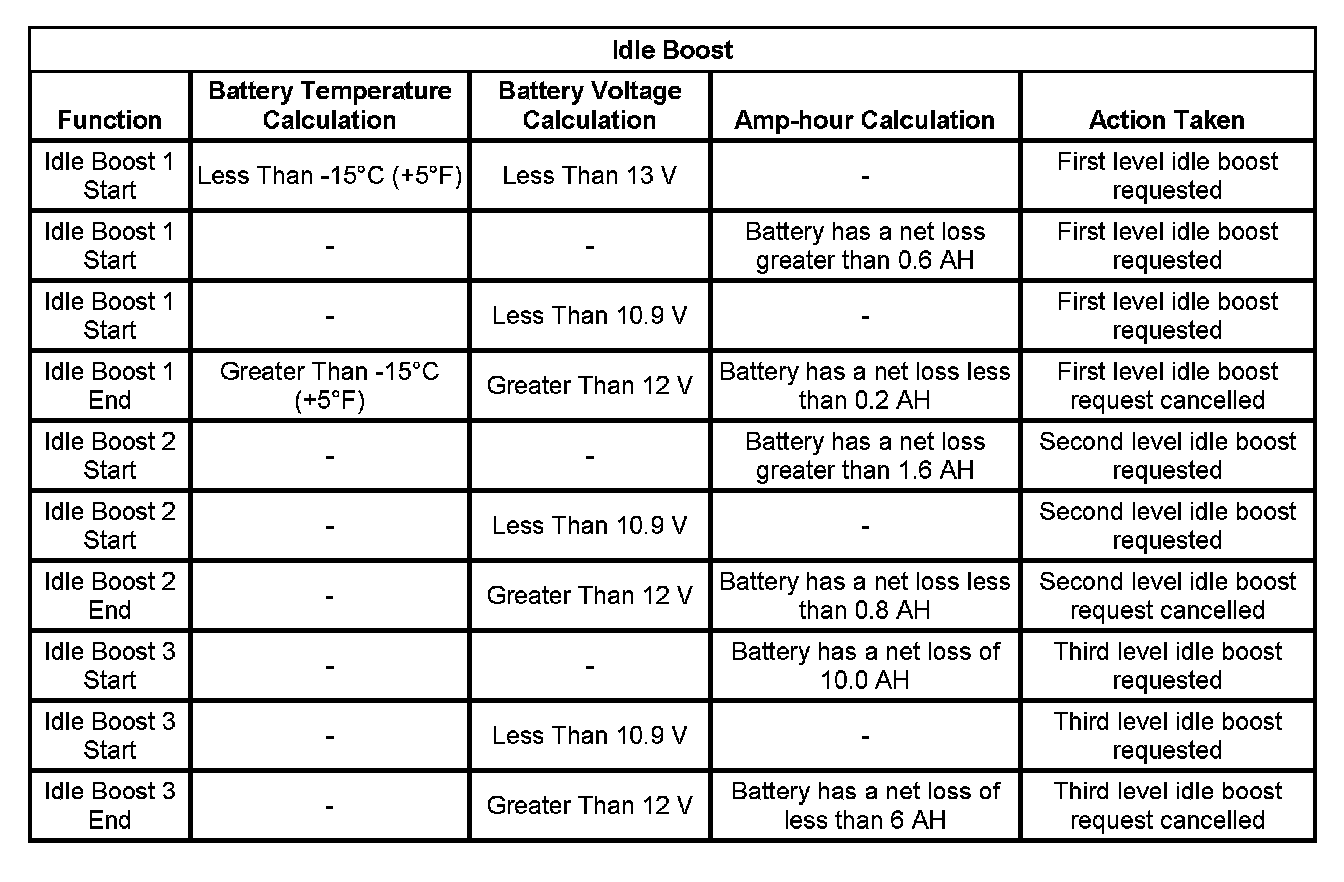 Idle boost is activated in incremental steps, idle boost 1 must be active before idle boost 2 can be active. The criteria used by the body control module (BCM) to regulate EPM are outlined below.