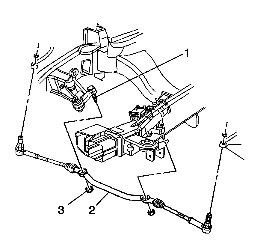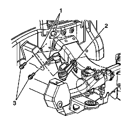 5. Remove the idler arm bolts (3) and the nuts (1) at the vehicle frame.