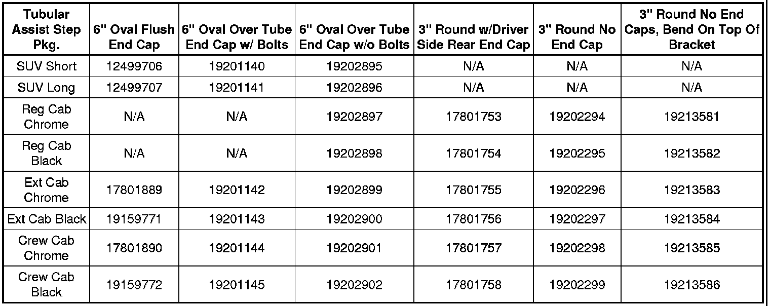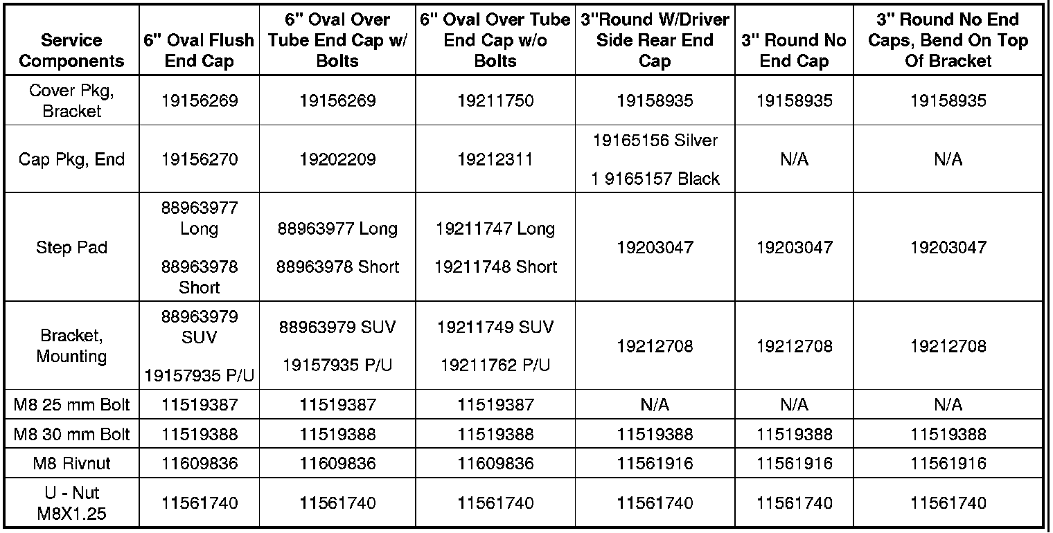 Dealers may not have been aware that the components of the tubular assist step packages, such as brackets, end caps, step pads and mounting hardware are available as service parts. This information is in the chart below.