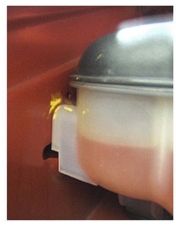 Use a plastic putty scraper to help prevent the rolling of the foam when installing the radiator surge tank as shown above. Install the radiator surge tank plastic tab into the matching retaining slot inside the right inner fender.