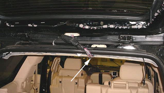 11. Install the liftgate connector C405/X405, wiring harness and the rear washer wiper hose back through the roof panel.