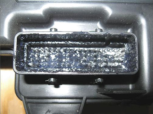 Fretting corrosion looks like little dark smudges on the electrical terminals and appear where the actual electrical contact is being made. In less severe cases it may be unable to be seen or identified without the use of a magnifying glass.