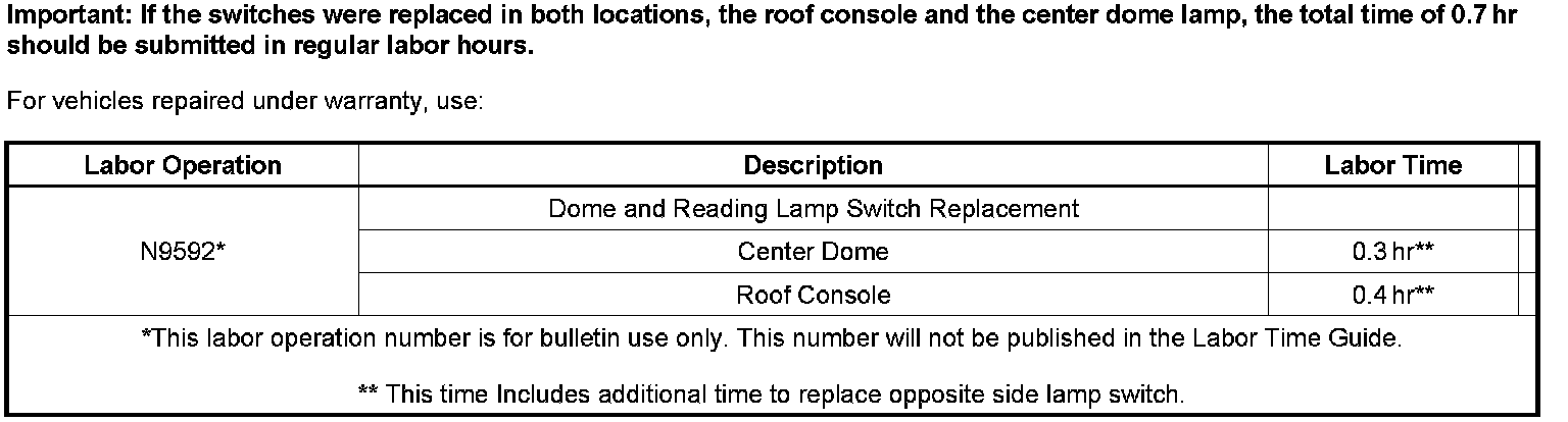 If the switches were replaced in both locations, the roof console and the center dome lamp, the total time of 0.7 hr should be submitted in regular labor hours.