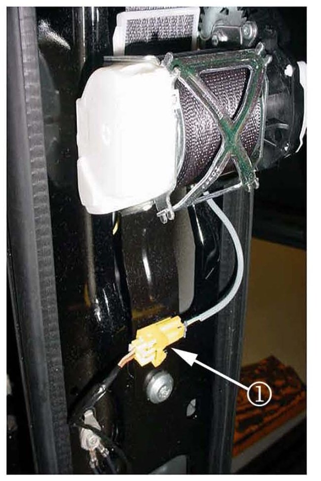 Before replacing the front seat belt retractor assembly, remove the components necessary to gain access to the connector (1) and follow the procedure outlined below.