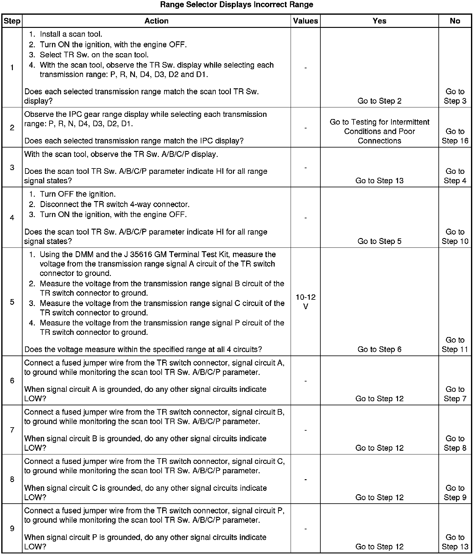 Refer to the Transmission Range Switch Logic (Transmission Range Switch Logic) table for valid combinations of switch signal circuits A, B, C and Parity. On the table, HI indicates an ignition voltage signal. LOW indicates a zero voltage signal.