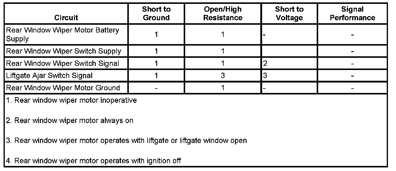 ^ If the rear washer pump operates normal and the rear wiper motor is inoperative, refer to the Rear Wiper Motor Circuit Test.