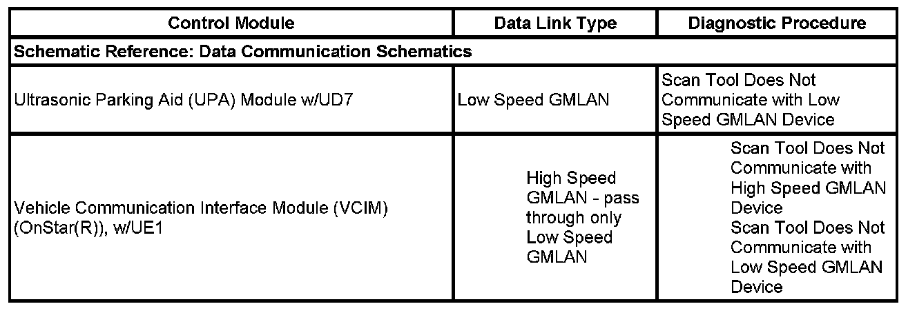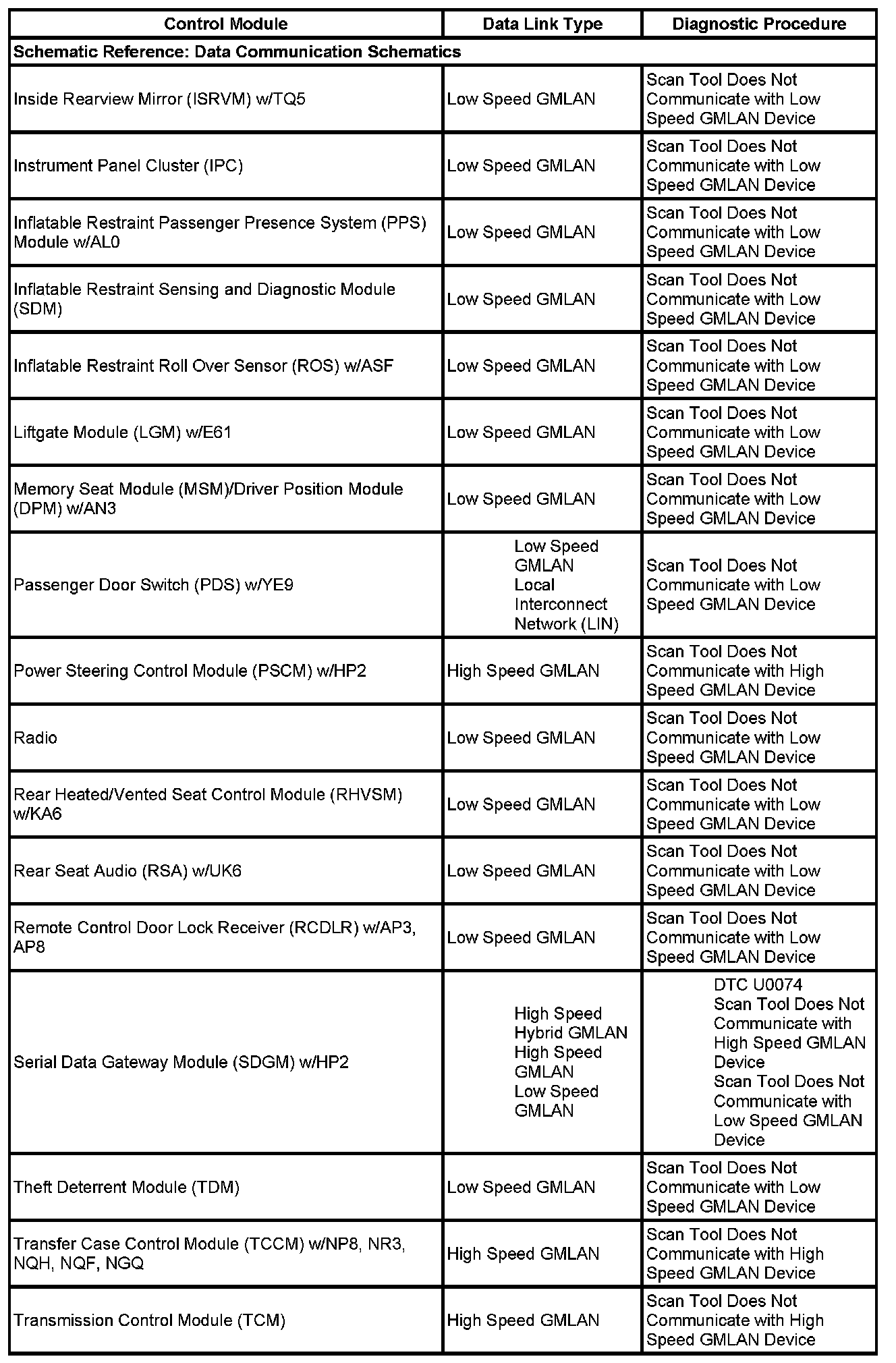 This table identifies which serial data link that a particular module uses for in-vehicle data transmission. Some modules may use more than one data link to communicate. Some modules may have multiple communication circuits passing through them without actively communicating on that data link. This table is used to assist in correcting a communication malfunction. For the description and operation of these serial data communication circuits refer to Data Link Communications Description and Operation.