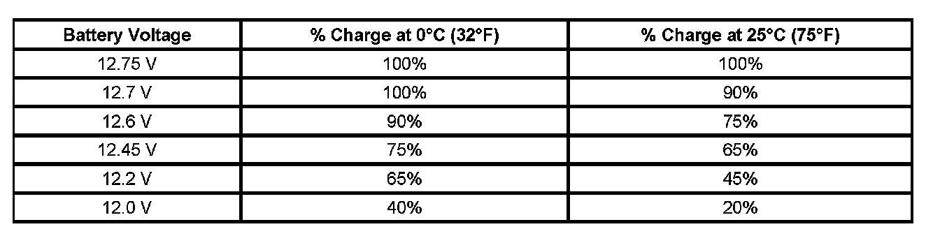 Important: Using voltage to determine the batteries state of charge (SOC) is only accurate after the battery has been at rest for 24 hours. This is enough time for the acid in each cell to equalize. If the battery has been charged or discharged in the past 24 hours, the battery SOC will only be an estimate.