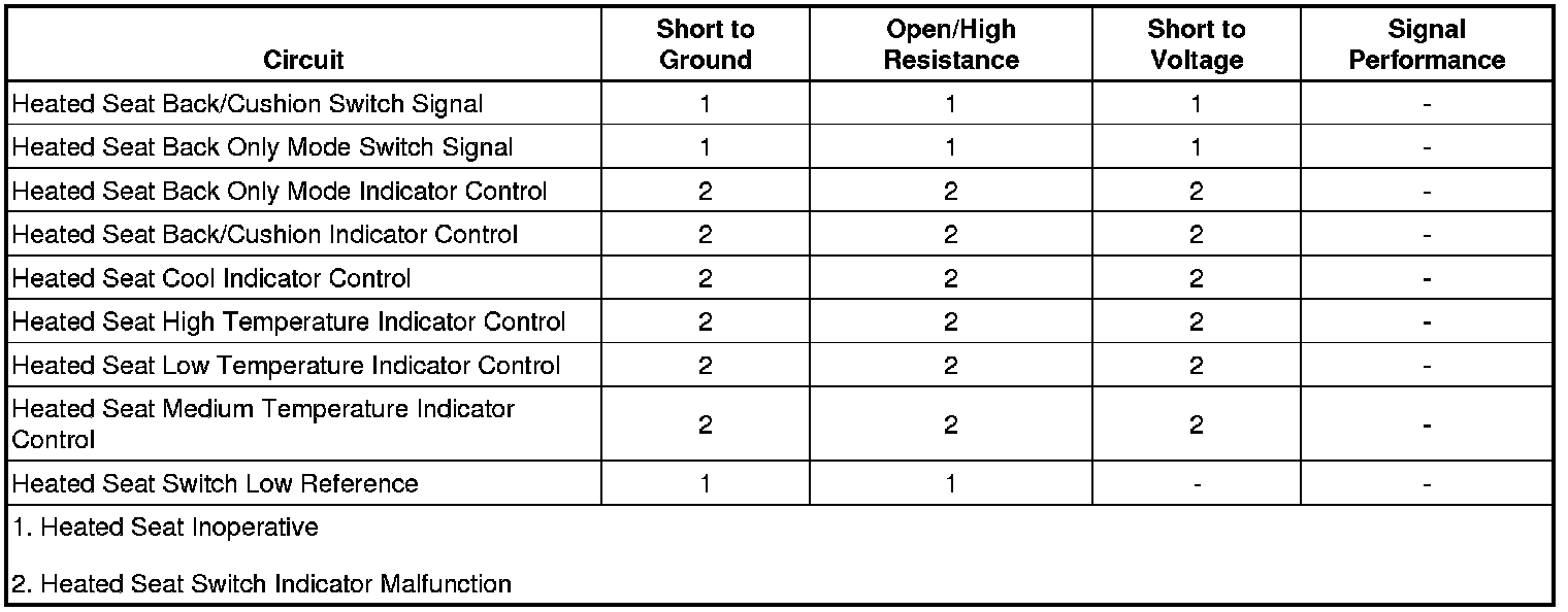 The driver and front passenger heated seats are controlled by separate heated seat switches. The switches are located on the door panels. When a heated seat switch is pressed, ground is momentarily applied through the switch contacts and the switch signal circuit to the door module. In response to this signal, the door module sends a message via the low speed GMLAN serial data line to the memory seat module (MSM) indicating the heat seat request. The door module then applies voltage through the appropriate indicator control circuits to the heated seat switch illuminating the appropriate indicators.